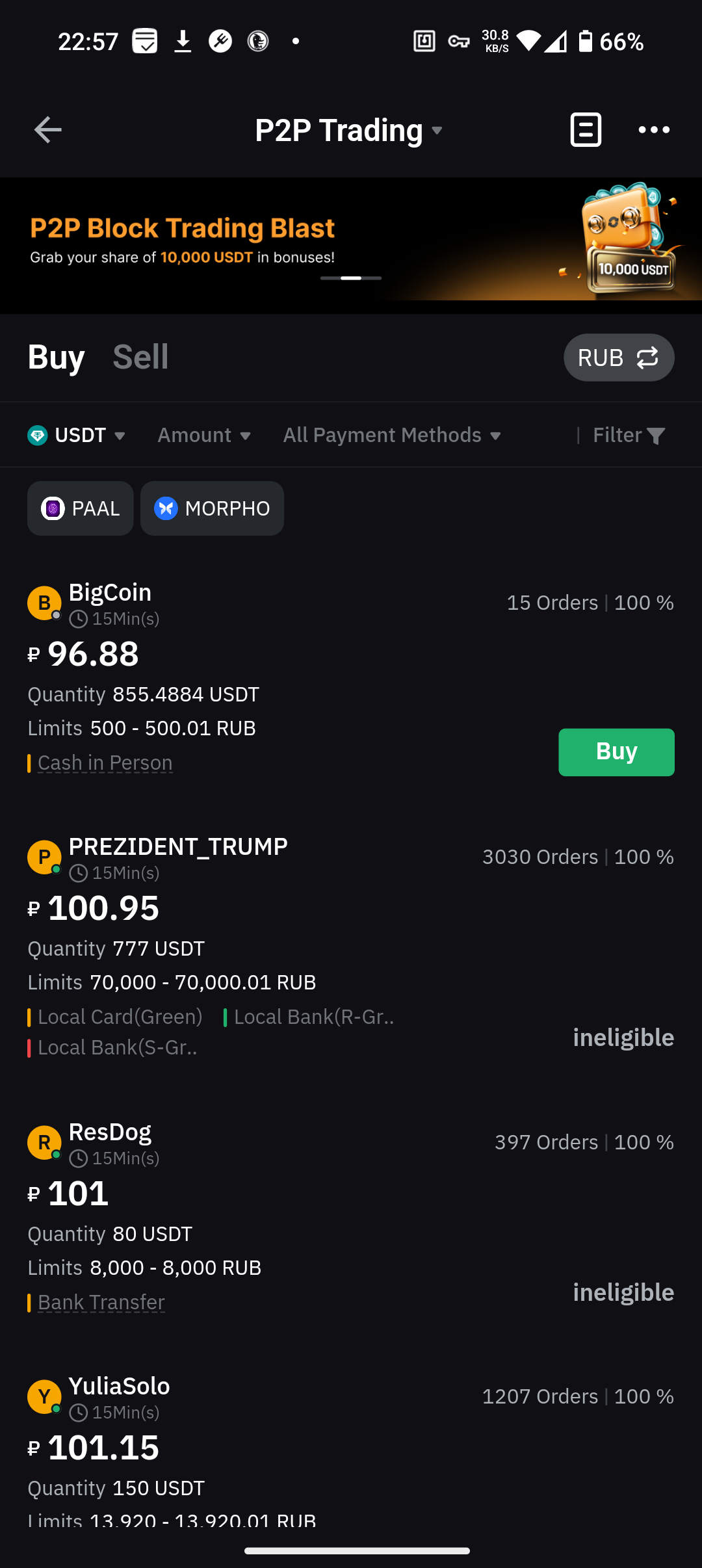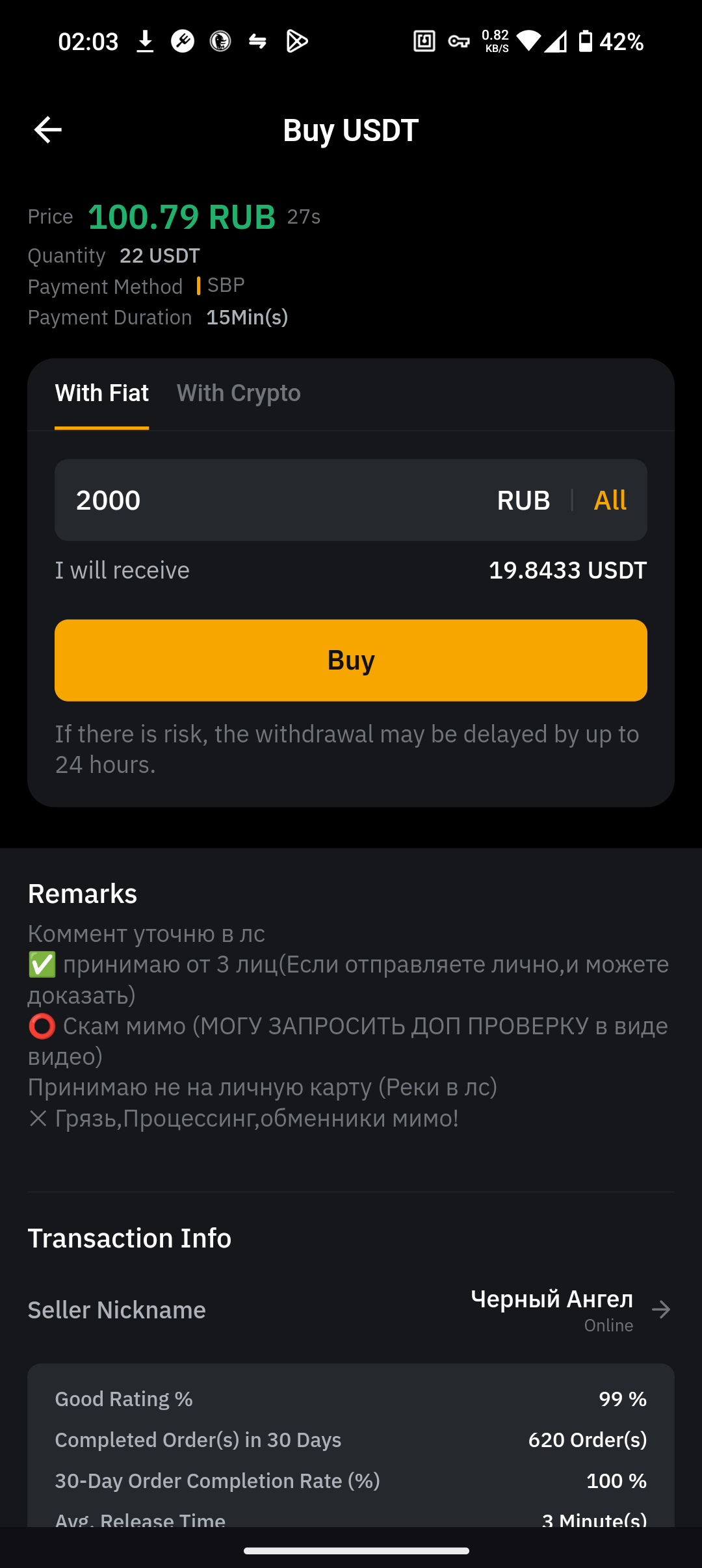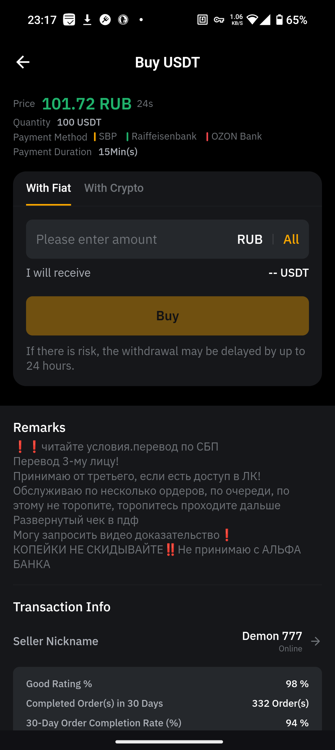 В общем, выбираем подходящего трейдера. Тапаем по сделке, вводим сумму, которую хотим обменять (в рублях или в USDT) и нажимаем BUY:
