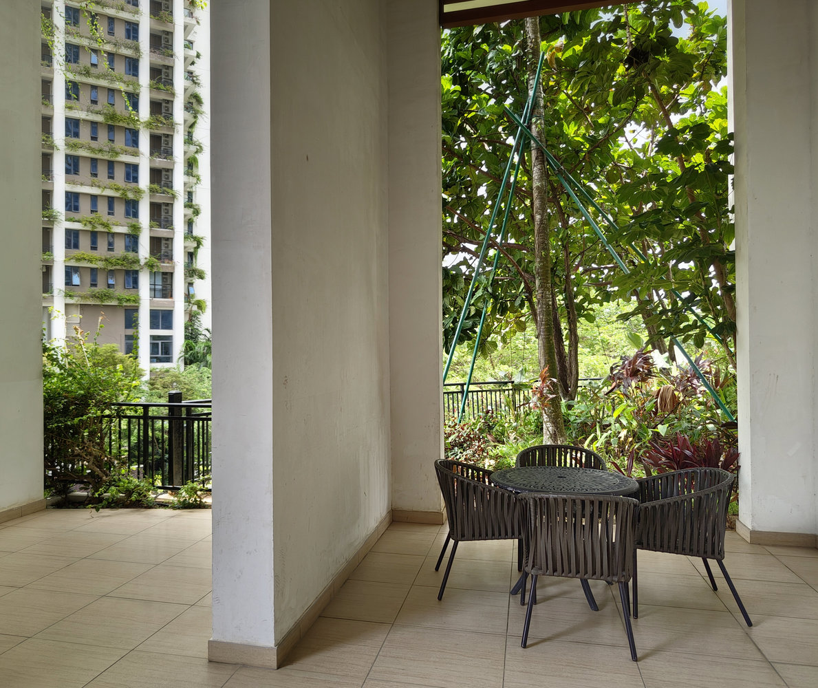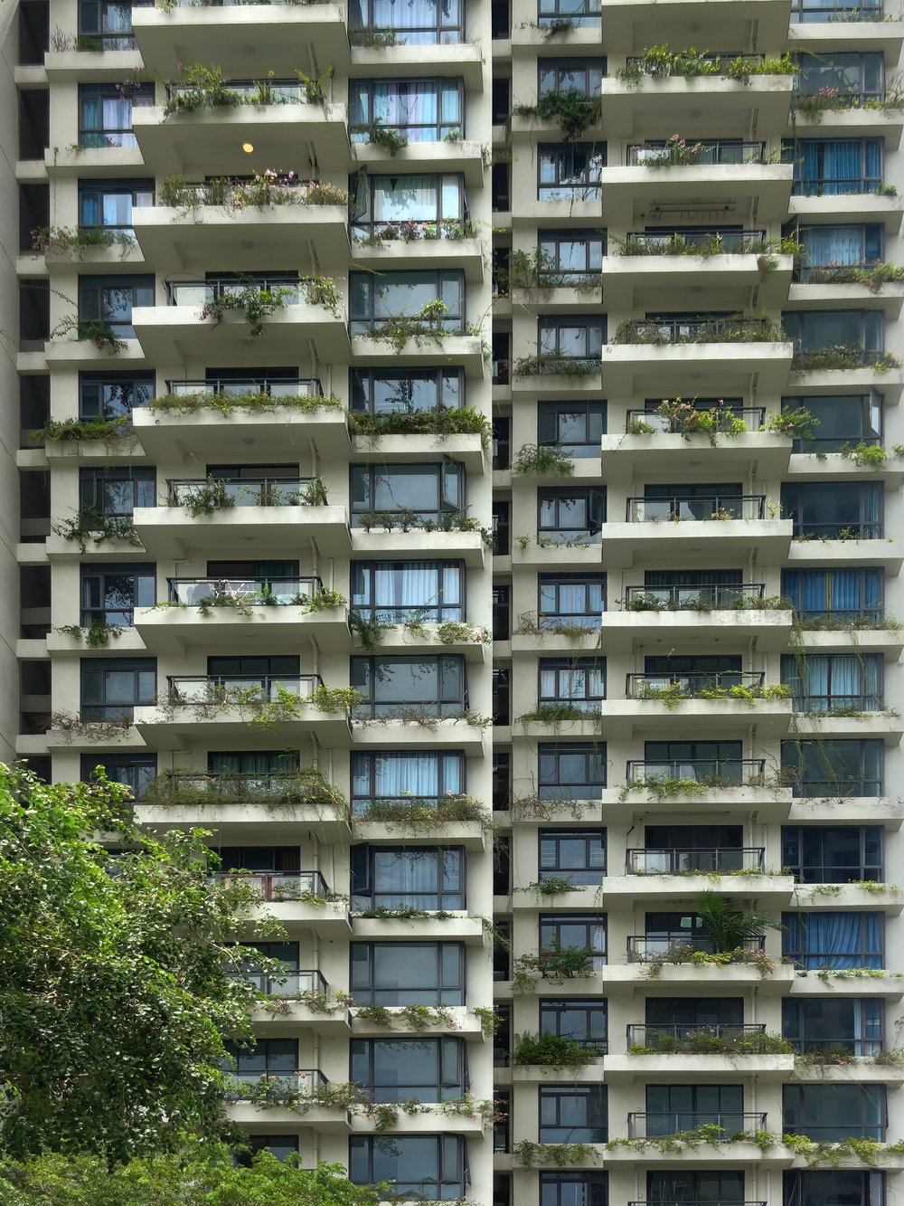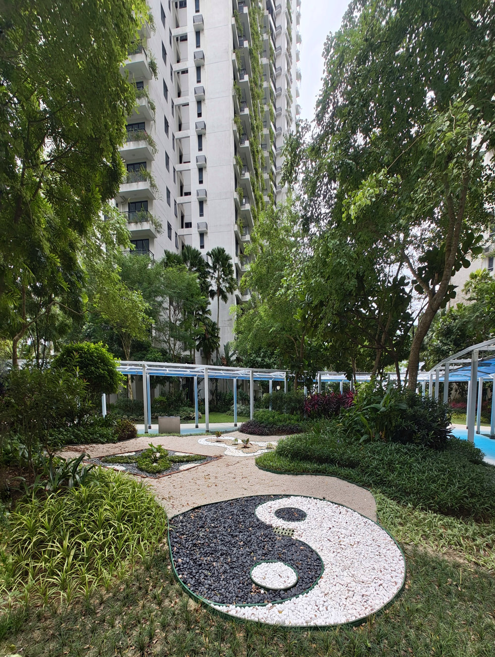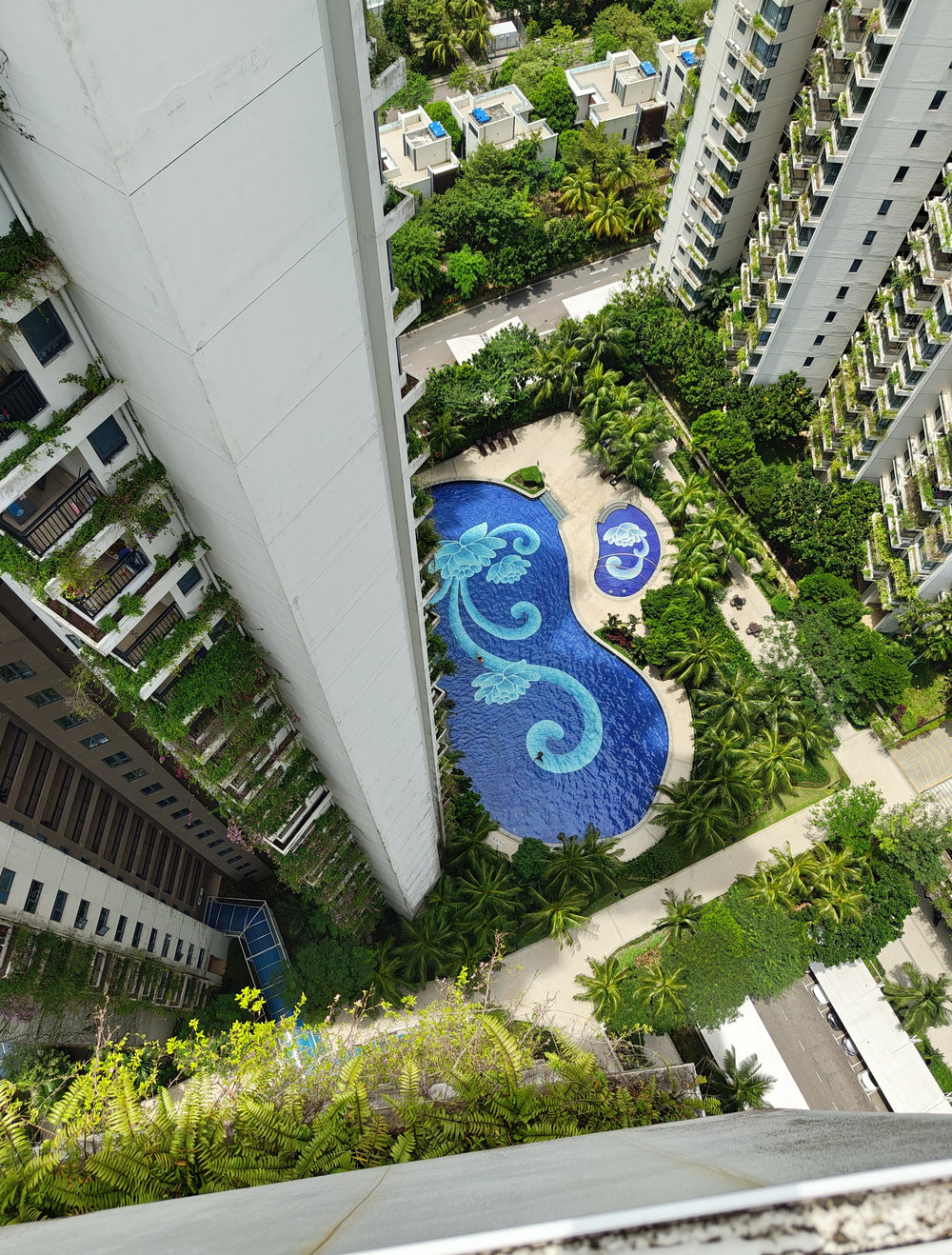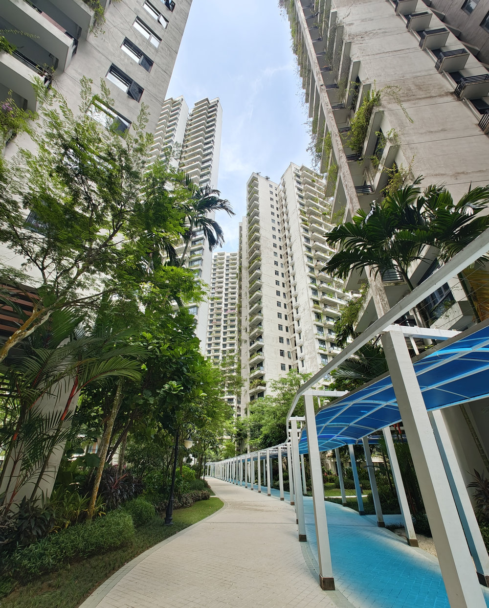 На уровне четвёртого этажа все дома квартала соединяются между собой пешеходной дорожкой. И там же все фасилити: бассейн, тренажёрка, теннисный корт, детские площадки и т.п.: