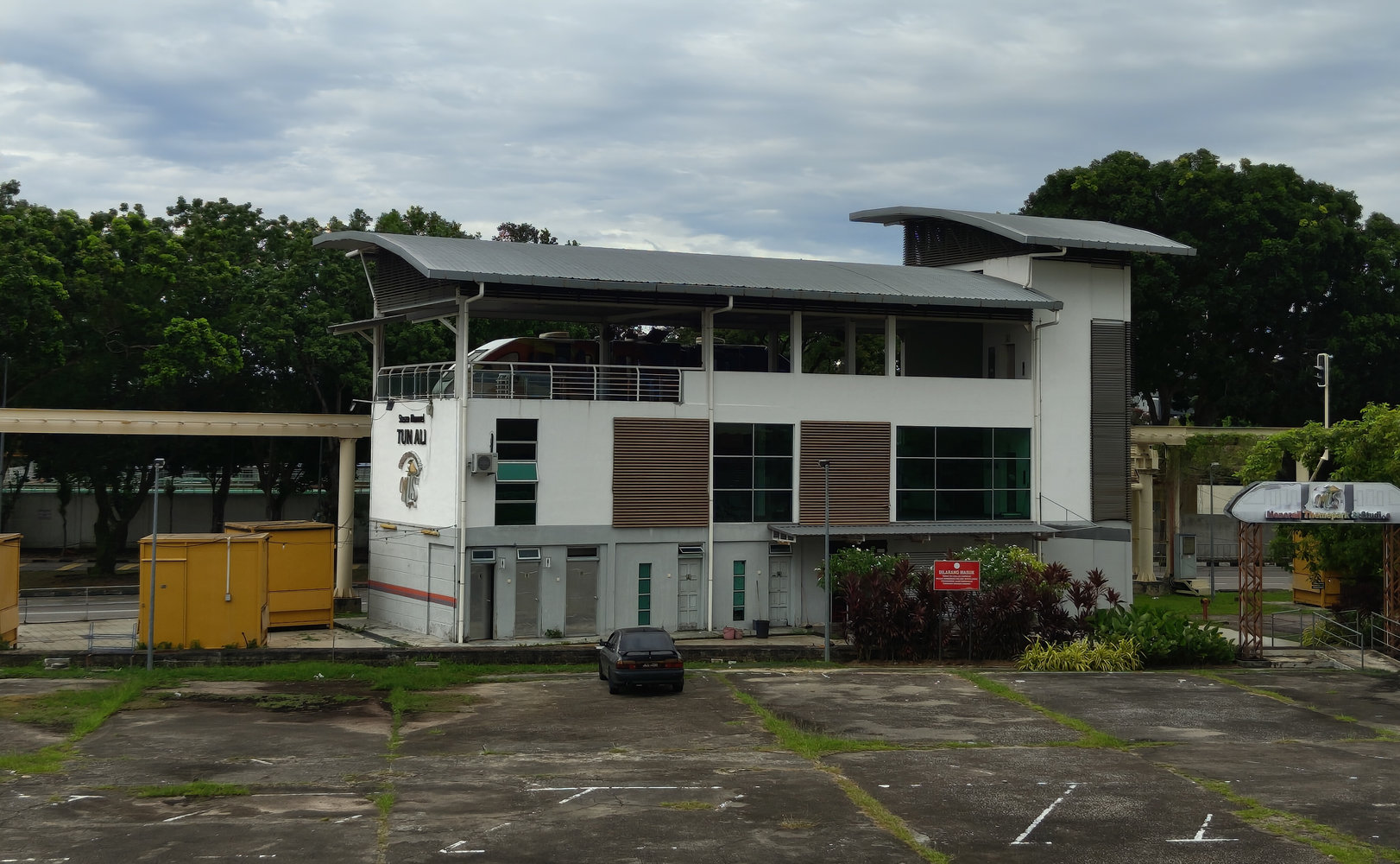 А вот вторая: Tun Ali - вполне себе интересная. Во-первых, там сразу два здания: станция и депо. Сама станция закрыта и там сбоку сидит какой-то мужик в конторке.
