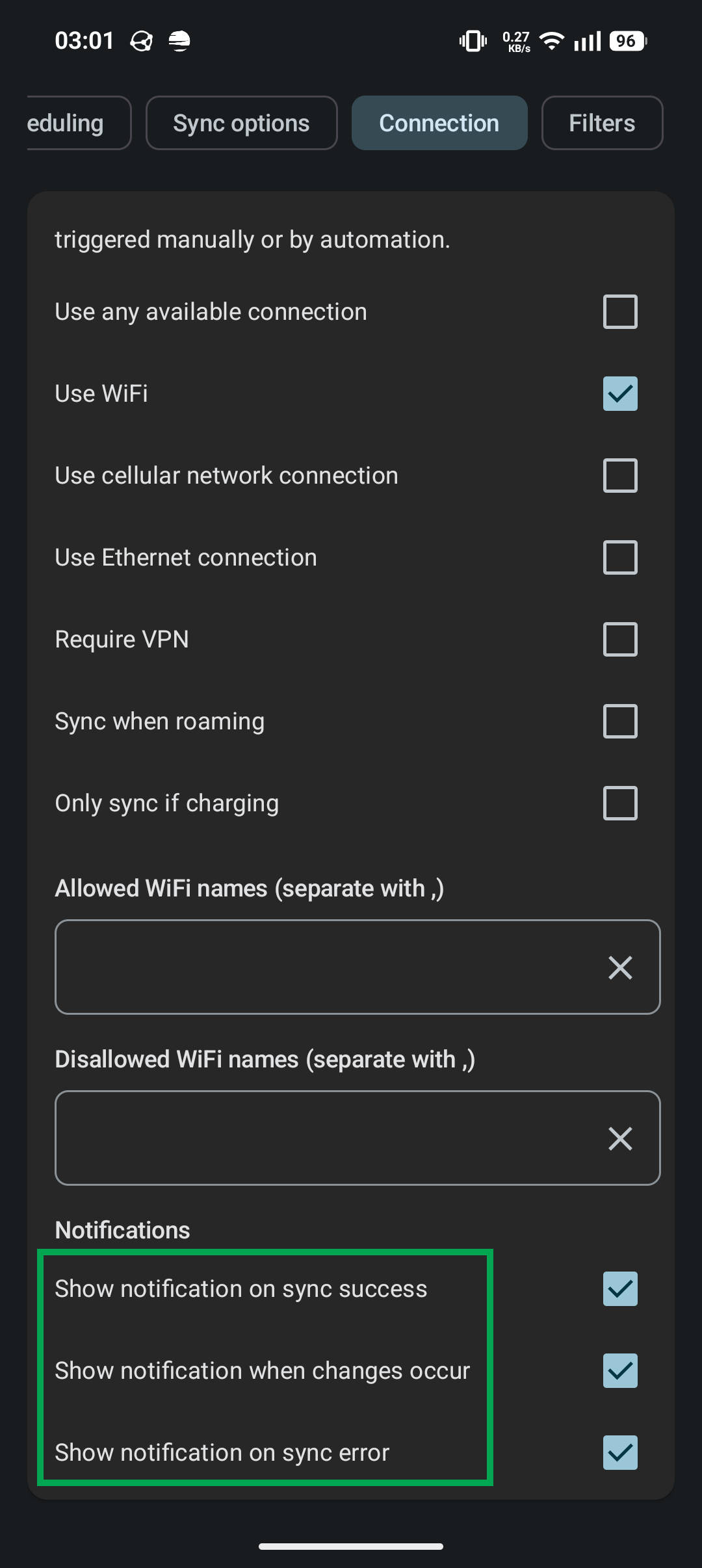 Тут всё ясно, по желанию. Я ставлю в еженедельное расписание только те папки, которые синхронятся исключительно между телефоном и облаком. Те же, что есть ещё и на ноуте, всё равно обновятся через SynxThing (о нём позже), поэтому зачем плодить сущности и тратить траффик и батарею.