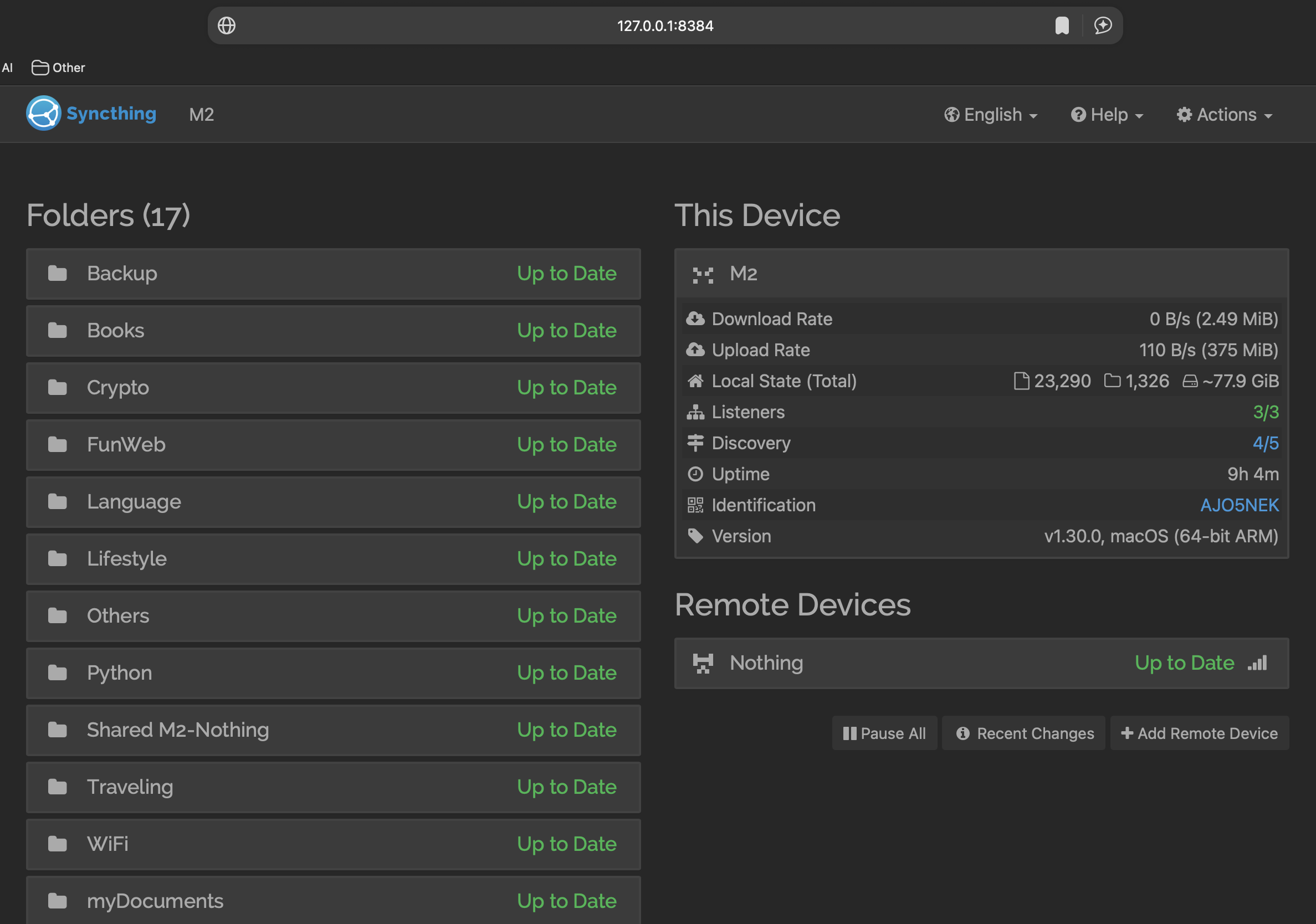Версию для MacOS silicone я качала отсюда: sourceforge.net, и почему-то она v.1.30.0-1. На официальной же странице syncthing.net она v.2.0.13. Видимо у меня какой-то форк, но пока что не сильно забиваю этим голову, главное что работает