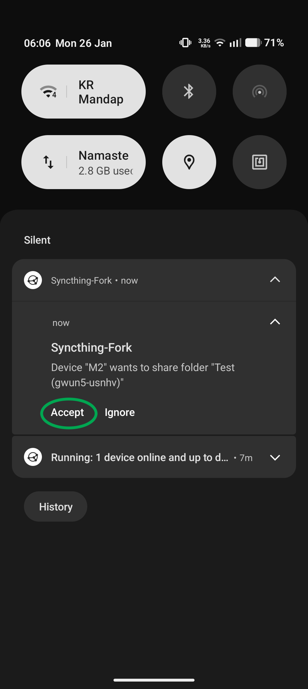 На телефоне тоже форк из F-Droid: Syncthing-Fork. Так же он есть и в PlayMarket, но какой-то другой.