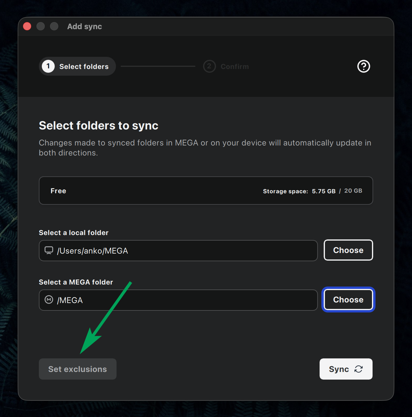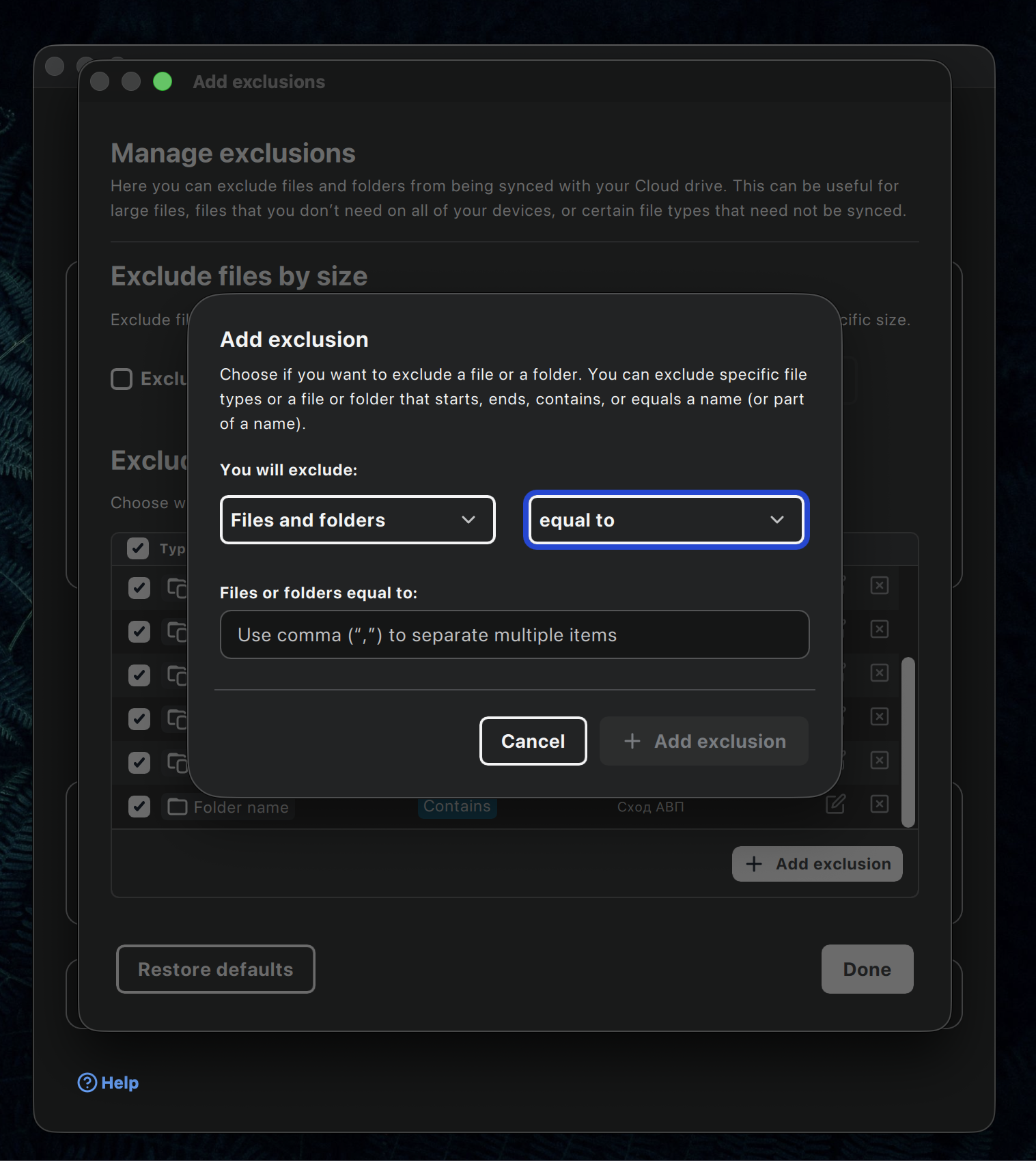 Sync, нажимаемSet exclusions:И выставляем какие папки и файлы на данный момент, на данном устройстве не нужно синхронизировать. Они никуда не денутся. Но исключение их из синхронизации позволяет управлять ими по отдельности. То есть удаление из с ноута не удалит их из облака и наоборот: