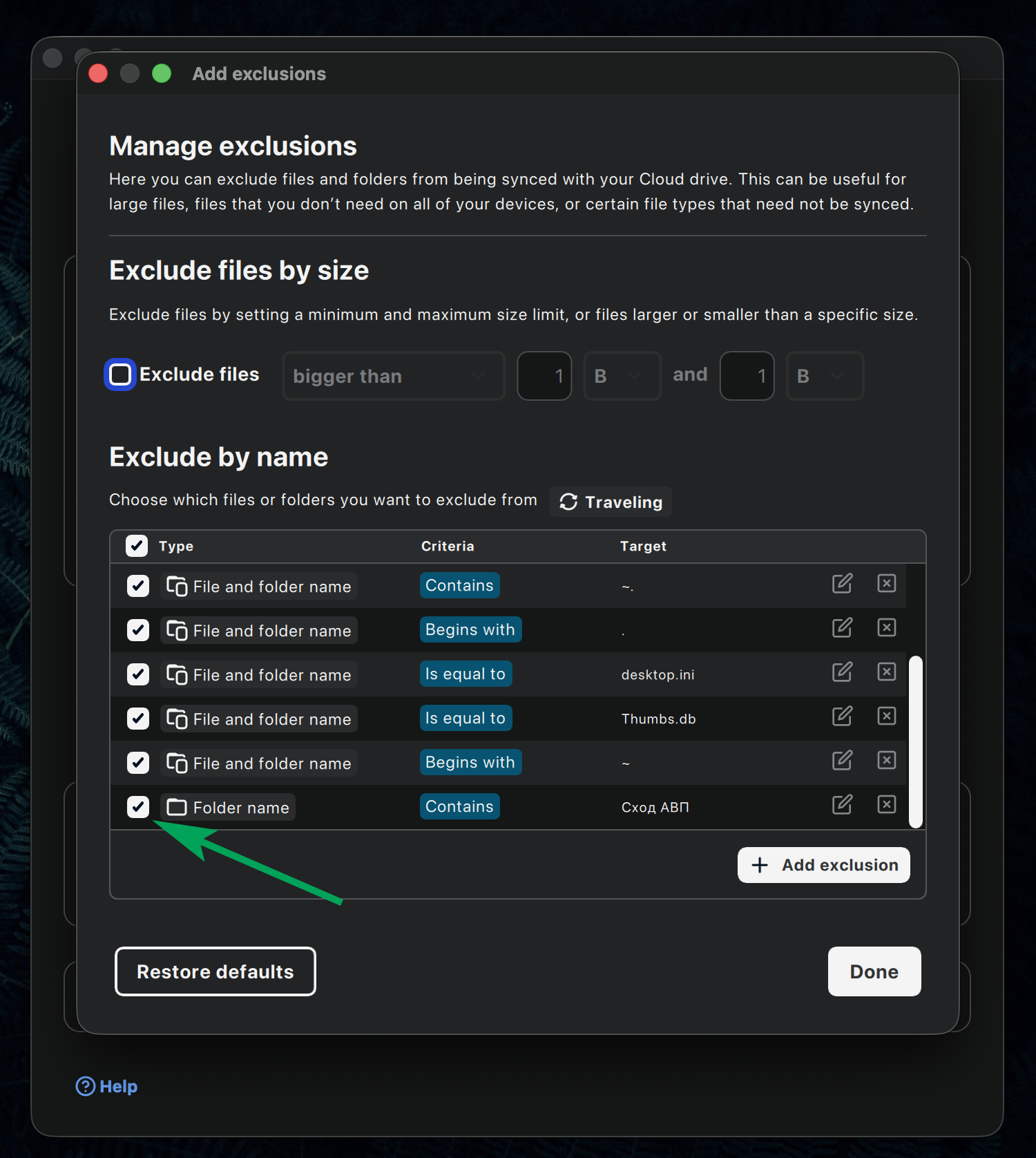 Ну и дальше в каждой конкретной синхронизации добавляю если что-то ещё надо исключить. Не обязательно писать полное название папки или файла, достаточно части. Например "Сход АВП - аудиозаписи лекций" можно сократить до "Сход АВП*"