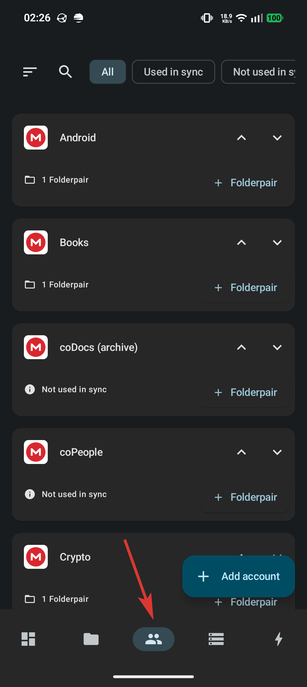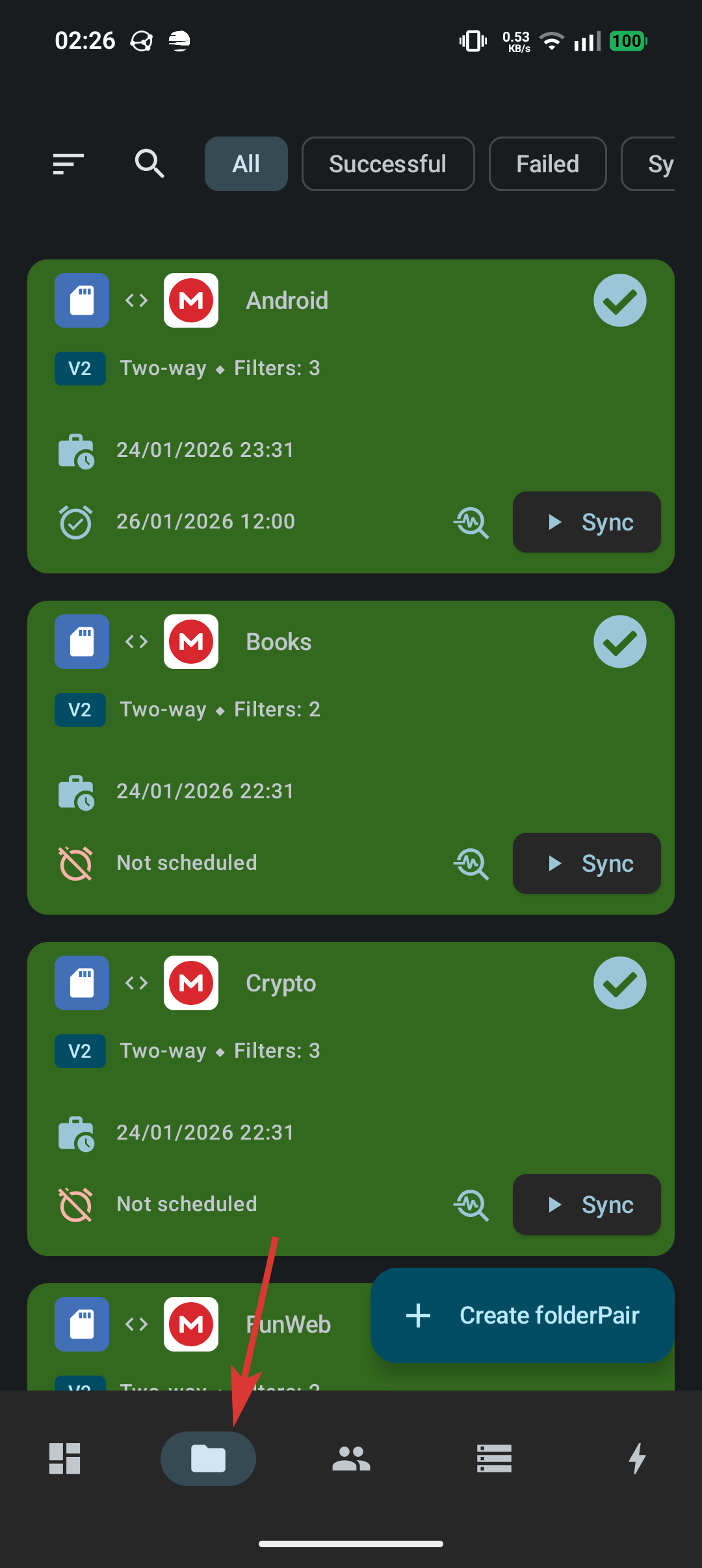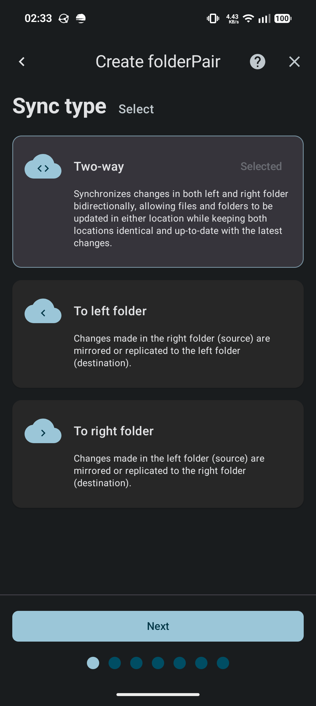 Create folderPairи выбираем тип синхронизации. Я всегда выбираю двухстороннюю.Выбираем
